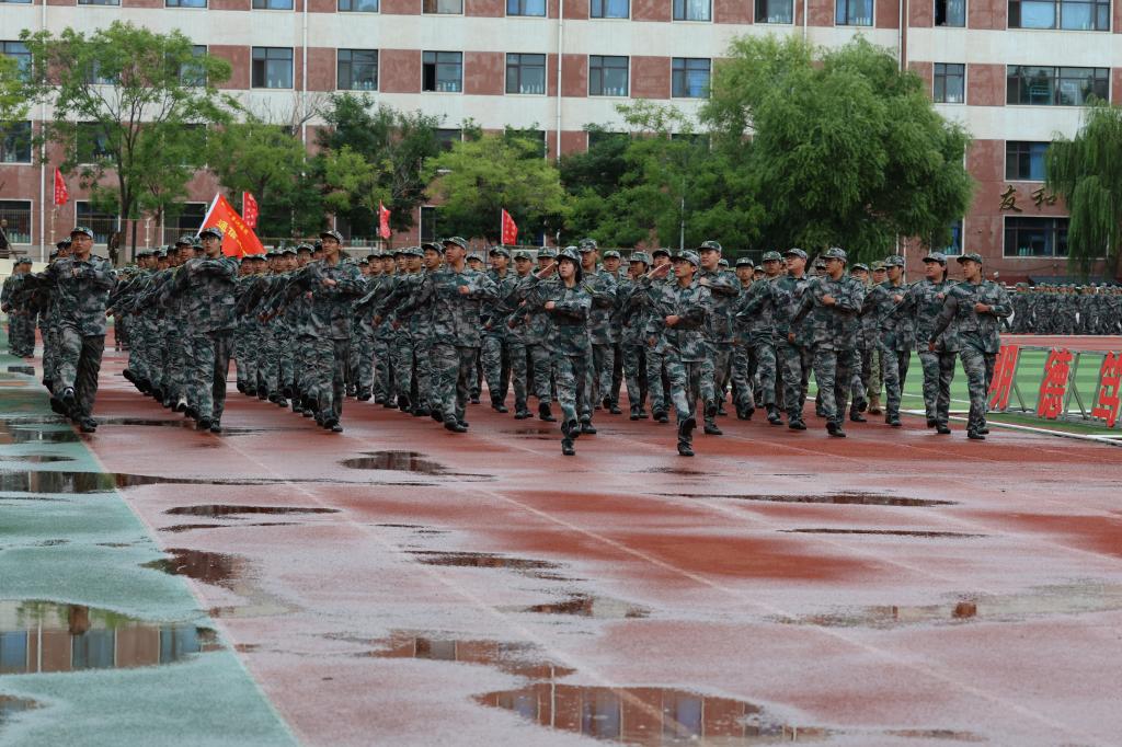 军训汇报表演中,电气信息学院和铁道机车学院分别带来精彩的匕首操和刺杀操表演,动作整齐划一,口号响彻校园。