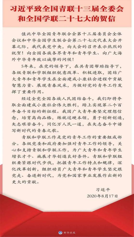 8月17日,习近平总书记为全国青联十三届全委会和全国学联 二十七大致贺信,信中充分体现了党中央对广大青年和青年学生的 亲切关怀,充分肯定了过去五年青联和学联在党的青年工作中发挥 的重要作用,对今后青联和学联工作提出了新的要求,对青年学子 寄予厚望,指明了前进方向。
